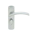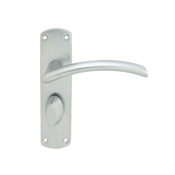 Backplate: 170mm long x 42mm wide Lever length: 113mm Projection: 69mm Plate thickness: 10mm Finish: Satin Chrome This bathroom door handle has a satin chrome finish. It has a turn...